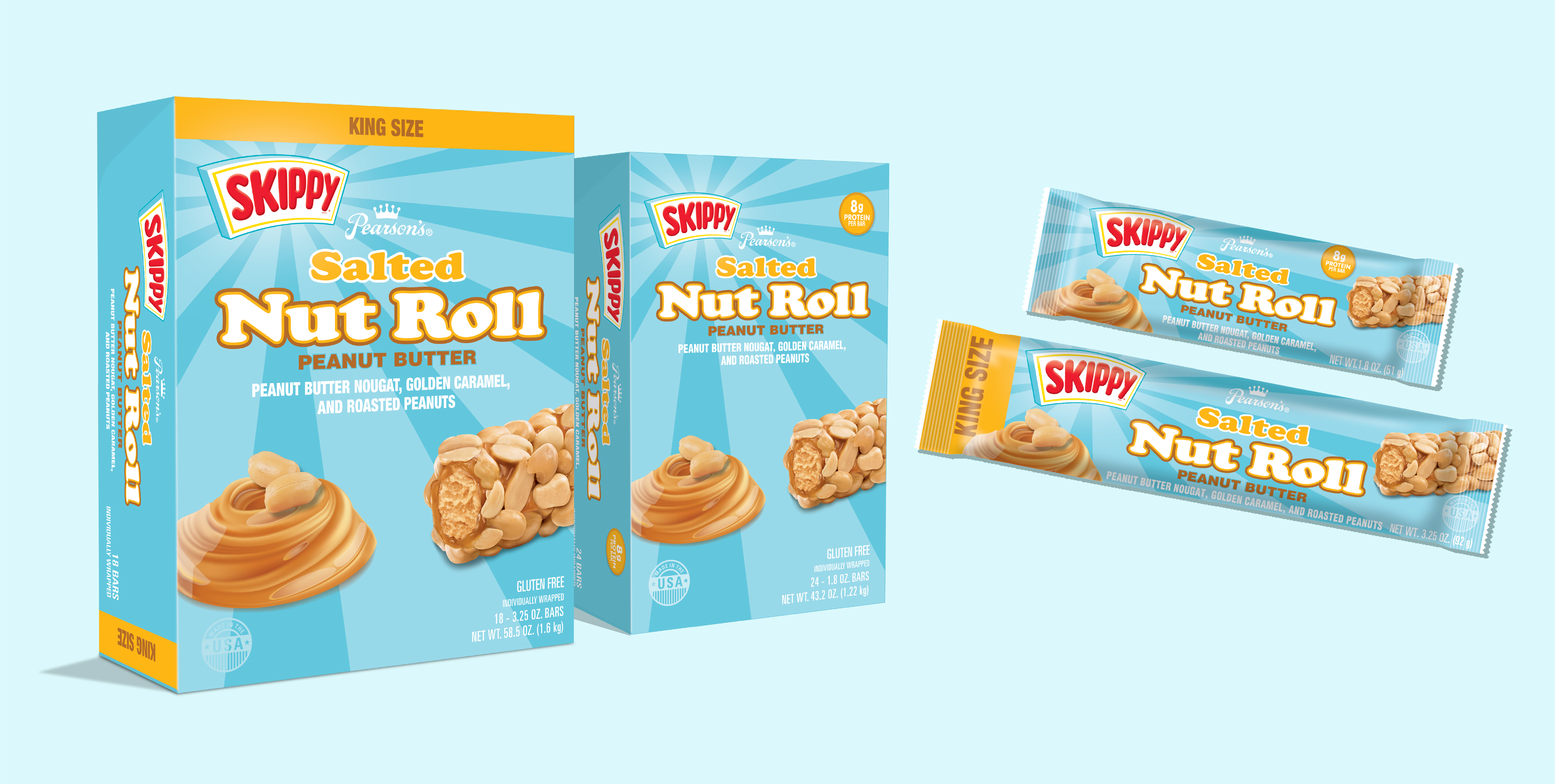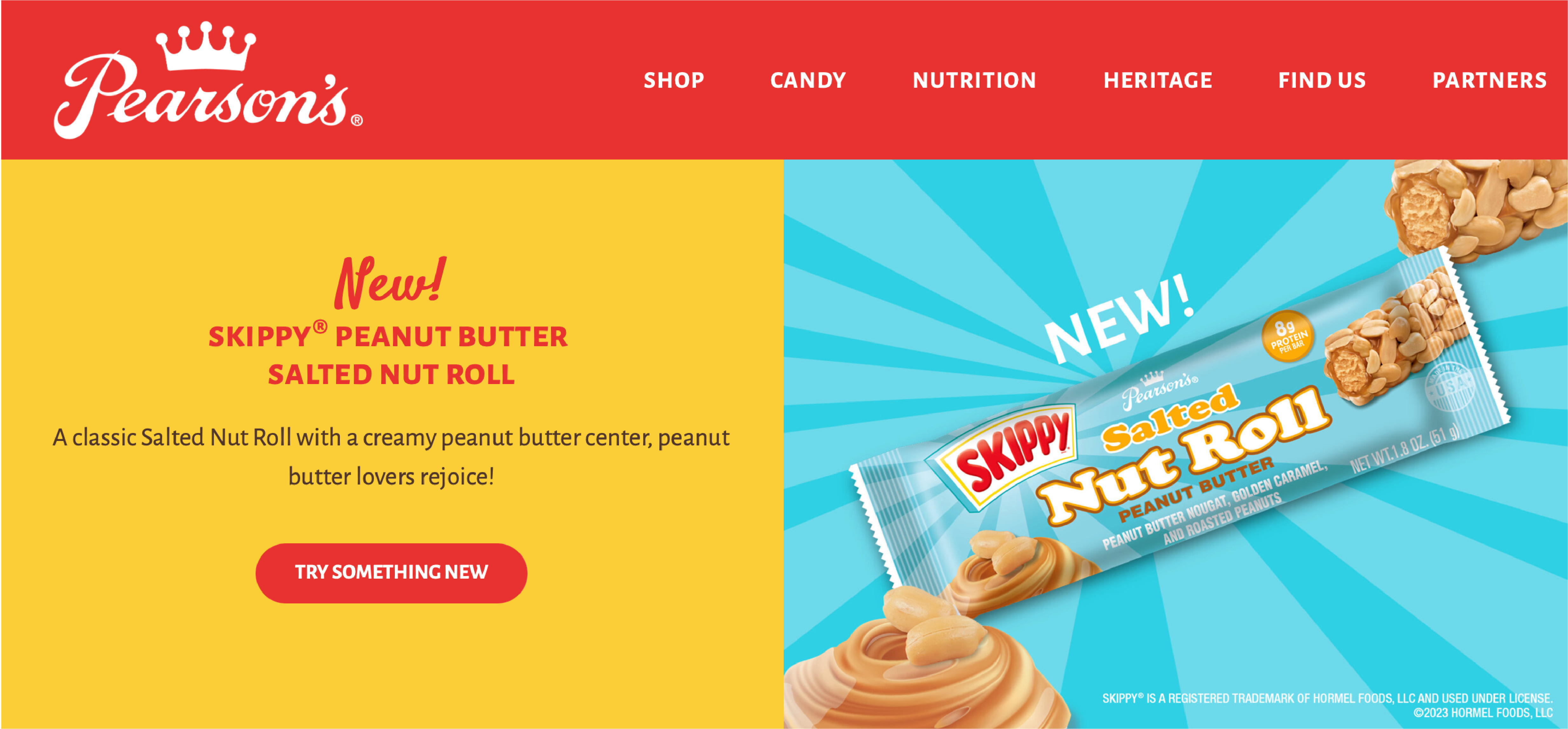 For the co-branded launch of the classic Salted Nut Roll with Skippy, I designed packaging that seamlessly integrated both brands across wrappers, cartons, corrugated POP display shippers, and bags. Integrating Skippy’s branding, I adapted designs for various printing methods while maintaining brand standards. I also created digital assets for the brand website and Amazon, updating sites to support the launch. Collaborating with Hormel under Pearson’s marketing director, I prepared and presented designs, efficiently implementing feedback. The project earned recognition as an Innovative Product at the 2023 Sweets and Snack Show.